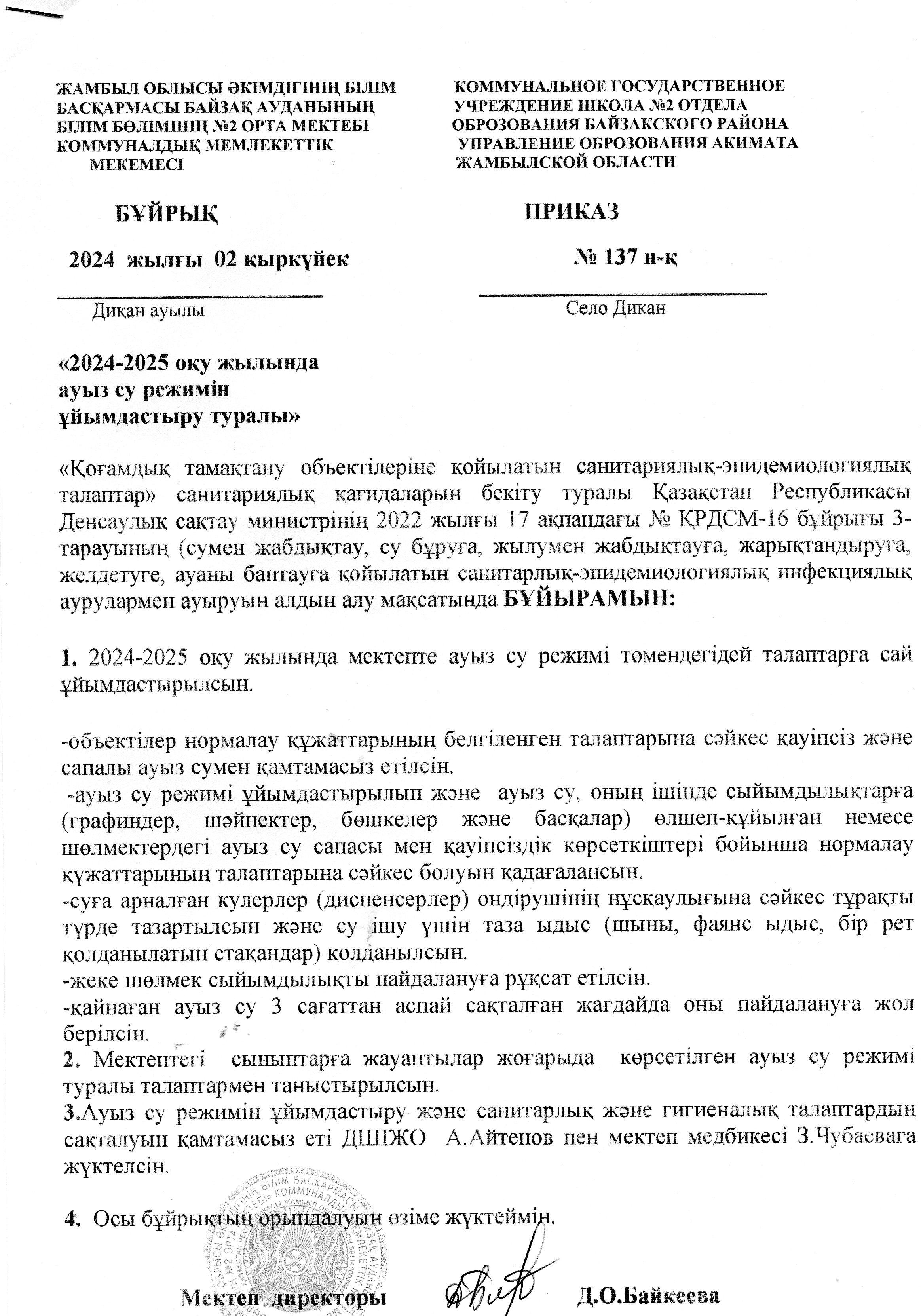 2024-2025 оқу жылында ауыз су режимін ұйымдастыру туралы » сш. Дихан
